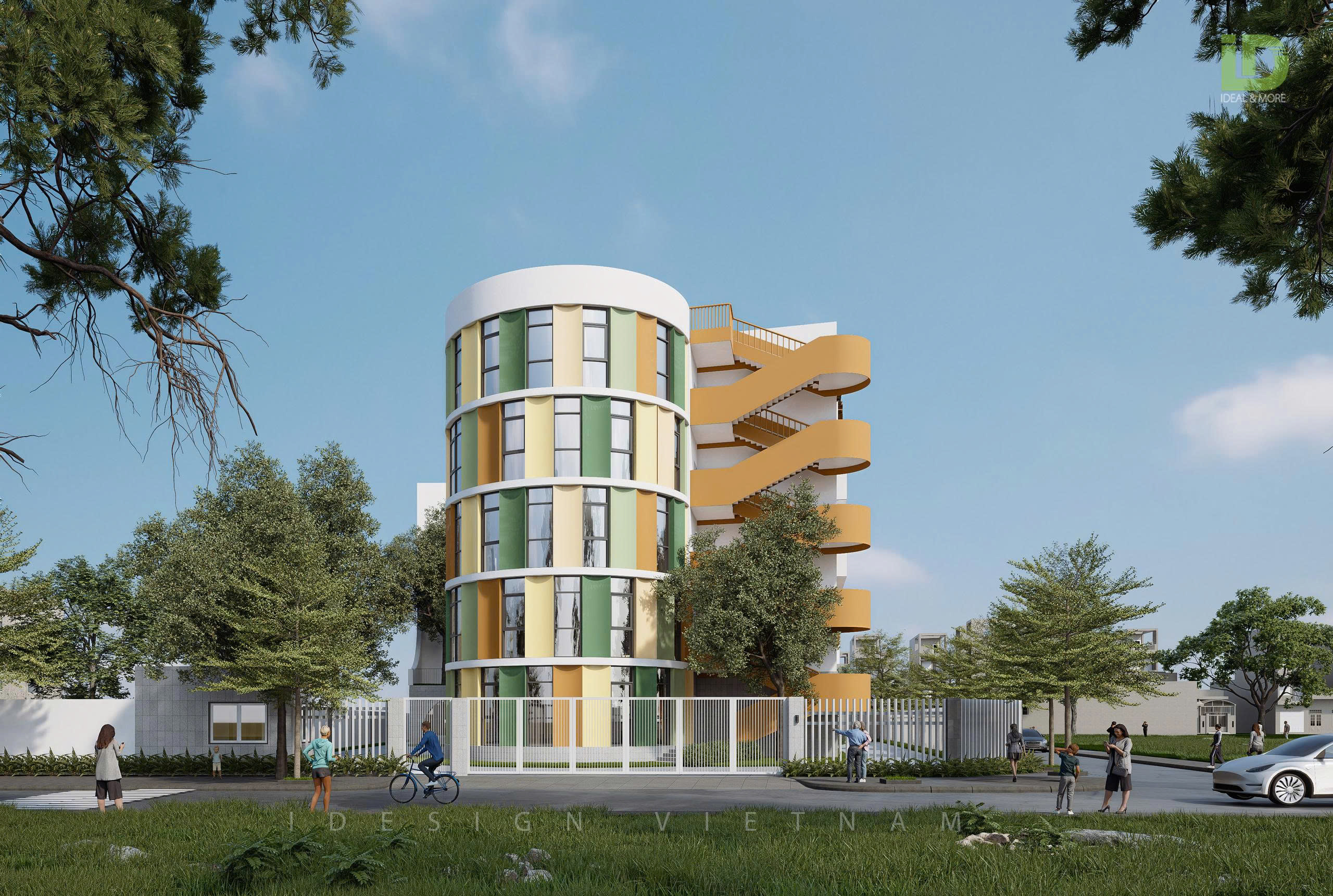 Công trình được bố cục theo dạng mở, lấy sân trung tâm làm lõi sinh hoạt – vừa là khoảng đệm thông gió, lấy sáng tự nhiên, vừa là không gian giao tiếp và hoạt động ngoài trời. Hệ thống lam chắn nắng và mảng tường cong tạo nên nhịp điệu nhẹ nhàng, đồng thời xử lý tốt yếu tố khí hậu. Vật liệu, màu sắc và chi tiết đều được tiết chế, ưu tiên tính bền vững và cảm giác thân thiện, gần gũi.