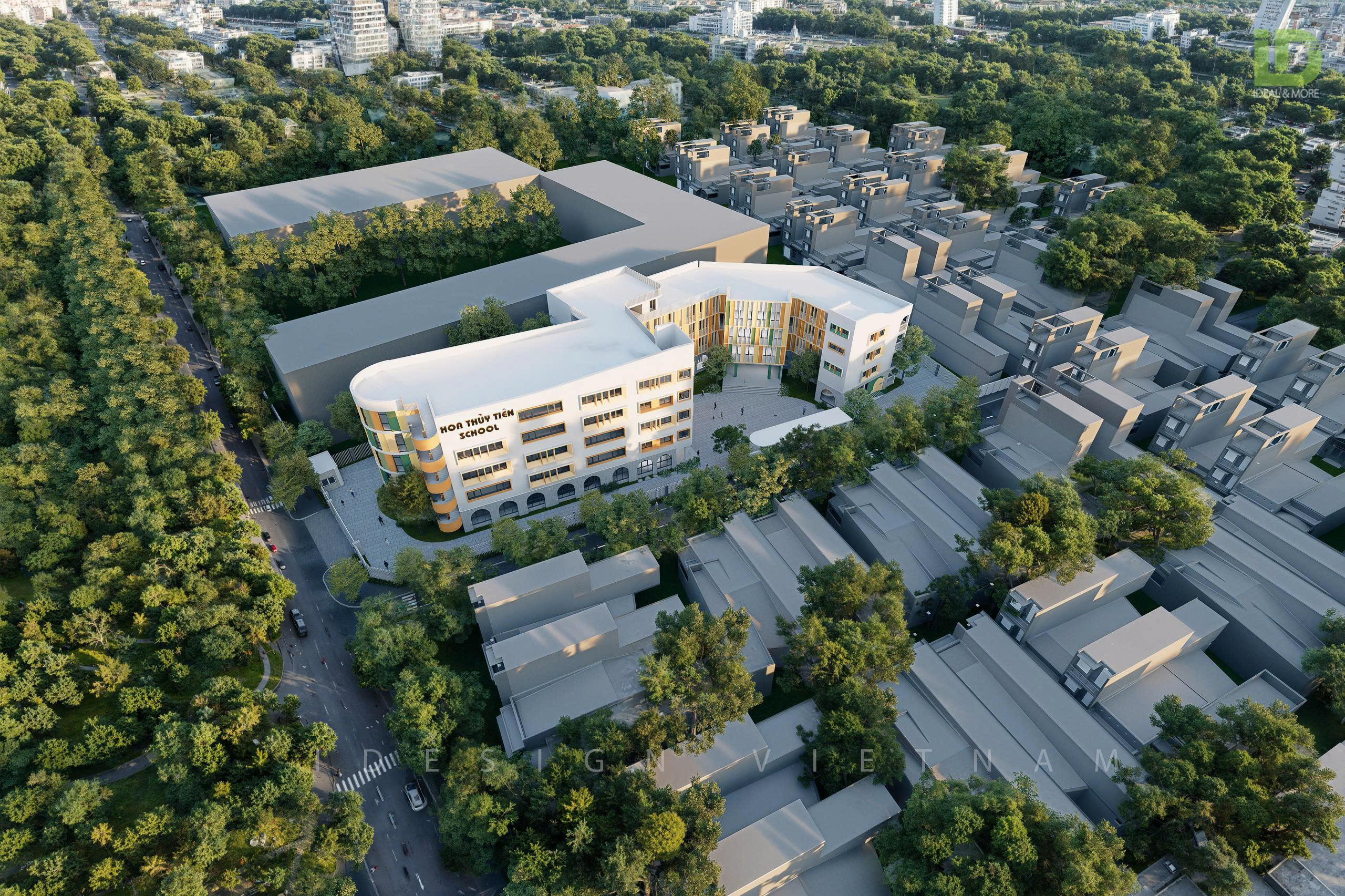 Dự án Trường liên cấp Hoa Thủy Tiên được phát triển trên nền hiện trạng cũ, kết hợp cải tạo và xây mới để hình thành một tổ hợp giáo dục liên hoàn – nơi các khối chức năng cũ và mới được kết nối chặt chẽ trong cùng một ngôn ngữ kiến trúc. Bài toán thiết kế tập trung vào việc tổ chức lại dòng di chuyển, bổ sung các không gian chung và tái cấu trúc cảnh quan, nhằm nâng cao hiệu quả sử dụng và chất lượng trải nghiệm cho học sinh.
